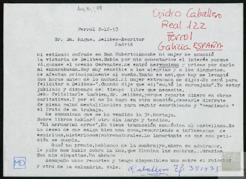 Felicitación de Ovidio Caballero a Miguel Delibes Setién por el Premio Miguel de Cervantes.
